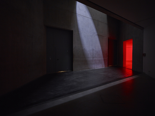 Mischa Kuball integrates a new element into this centre: halogen spotlights, a red, at first dangerous, threatening light into the corners of the wall, which is gradually superimposed by a warmer, almost orange glowing red. The visitor strolls through it. Suddenly it flashes stroboesk, the sequence ends and leaves black spots on the retina. One is, if you will, ‘flashed’ like the people in Barry Sonnenfeld’s Men in Black (1997): The effect of the reddish light from the halogen lamps is annihilated. What remains is the irritation of the eyes and the extremely short disbelief about what happened – was the red truly red? – until the halogen launchers start the circle anew. All throughout, the strobe flasher seems to scream silently, remains dangerous at first and then progresses increasingly harmoniously and warmly before it ends in an Anakoluth. This can certainly be understood as a metaphor for the singularity of the Shoah, with which the European history of Jewish life was abruptly interrupted and almost ended. After the anti-Jewish pogroms of the Middle Ages and early modern times, European Jews are gradually experiencing increasing cultural and legal integration and social participation. Then six million Jews are murdered.
