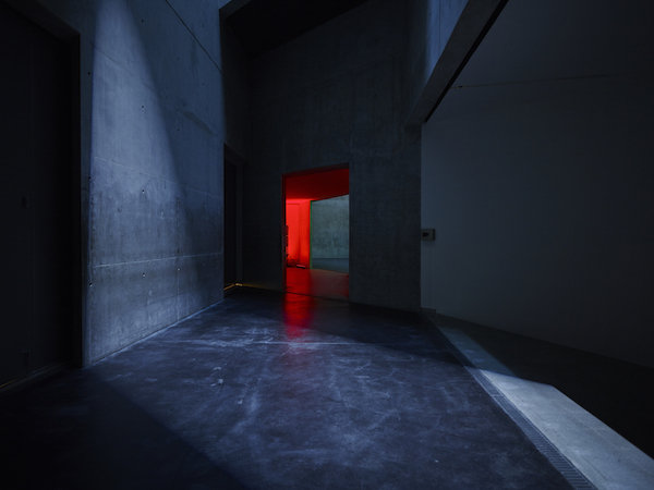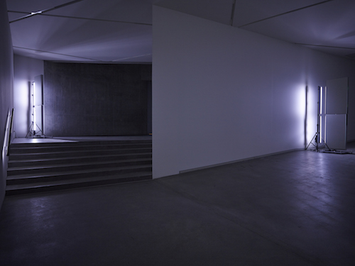 With reference to the motif of light in the dark Voids, Shelley Harten’s contribution follows the exclamation of the Russian avant-garde artist Aleksei Kruchenykh from 1913: “Sun, we’ll lock you up in a concrete house!” and Kasimir Malevich’s “Black Square” two years later. The combination of space and lighting in res.o.nant evokes Plato’s cave parable: “Kuball metaphorically repeats the situation of Plato’s cave inhabitants moving form darkness to light and back”. Shelley Harten shows that Kuball follows both his work on Plato and his reception of Malevich’s “Black Square” in the performance “Public Square” of 2007 (Hamburg) and 2015 (Thessaloniki). In res.o.nant the relationship between light and dark space confuses “the visitor’s capacity to see and perceive”. In her judgment, Shelley Harten explicitly refers to another part of the installation: between the two irradiated Voids there is a passage space, the center of the installation.